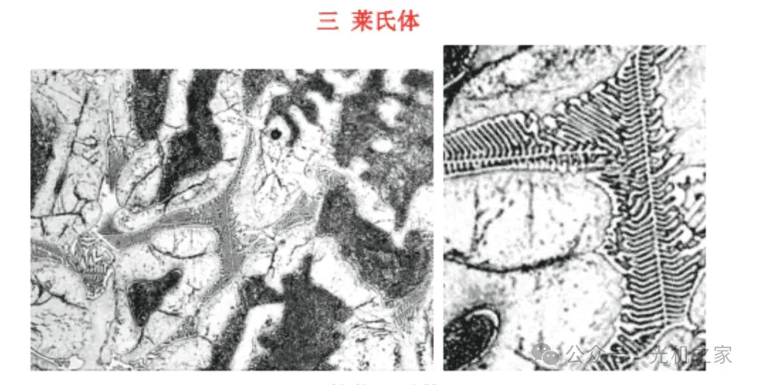 特征:莱氏体呈树枝状的奥氏体分布在渗碳体的基体上。莱氏体具有较高的硬度和脆性,是铸铁中的一种重要组织。
