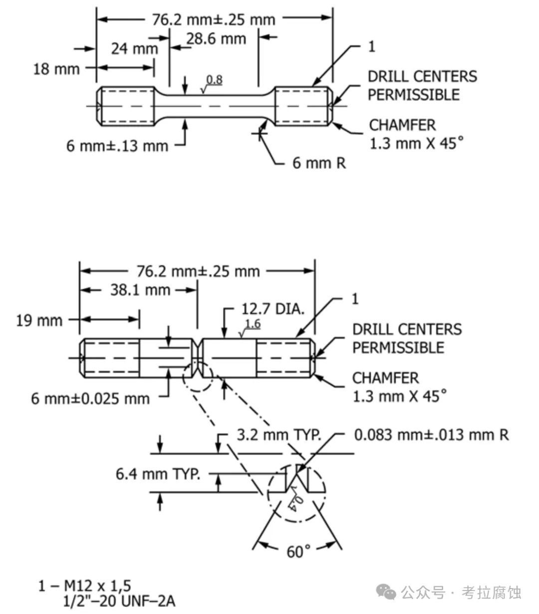 【1】ISO 16573:2015 Steel- Measurement method for the evaluation of hydrogen embirttlement resistance of high strenth steelsISO 16573:2015中推荐的试样尺寸,下图。直径D=10mm的试样为标准试样。根据实际情况,小尺寸试样(如,D=5mm),r/D=0.02等试样也可选用。【2】GB/T 39039-2020 高强钢氢致延迟断裂评价方法(Evaluation method for hydogen-induced fracture of high strength steels)取样部位按照GB/T 2975,推荐采用光滑试样、缺口试样、板状试样。试样几何尺寸如代表。建议采用直径10mm圆棒或厚度2mm的板状试样。【3】ASTM G142 Standard test methof for determination of susceptibility of metals to embrittlement in hydrogen containing environments at High pressure, High temperature, or Both中给出的标准光滑试样和标准缺口试样。【4】GB/T 34542.2 氢气储存输送系统 第2部分:金属材料与氢环境相容性试验方法,中给出的标准带缺口圆棒试样。