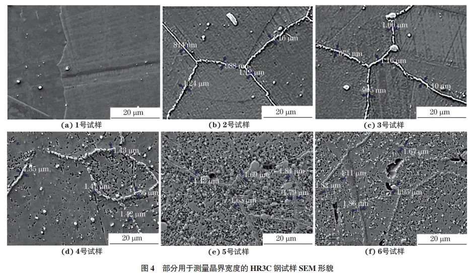 部分用于测量晶界宽度的HR3C钢试样SEM形貌如图4所示,测量结果如图5所示。1号试样的晶界宽度太小,故未对其进行测量。由图4可知:2号和3号试样的晶界呈粗线状,是由颗粒状第二相相连构成的,各处晶界宽度相近,主要为0.8~1.2μm;4号试样的晶界呈粗虚线状,由粗化成颗粒状和短棒状的第二相相连构成,宽度约为1.4μm;5号和6号试样的晶界呈断续条带状,由粗大第二相合并后形成,宽度有明显增大,分别约为1.7μm和2.3μm,其中6号试样晶界宽度非常不均匀,晶界宽度普遍超过1.8μm,部分区域出现超宽的晶界或亚晶界,局部区域宽度可达4μm;5号和6号试样的晶界(主要是三晶交界处)开始出现大尺寸第二相,且部分大尺寸第二相在制样过程中脱落。