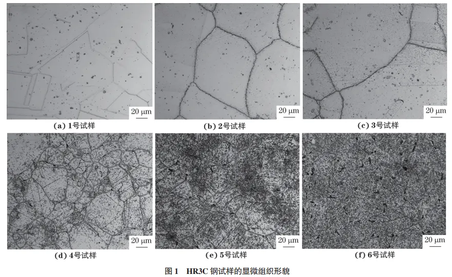 某已运行超过12万h超超临界锅炉的过热蒸汽出口温度为605℃,蒸汽压力为26.15MPa,在高温过热器同一管屏上取样,编号分别为2~6号,根据烟气走向及管内介质流向,2~6号试样的实际服役温度依次升高。另取1根同批次但未经投运使用的新管,编号为1号试样,对6根试样进行金相检验、力学性能测试、扫描电镜(SEM)及能谱分析,测试分析不同服役条件下6根试样的显微组织和性能。