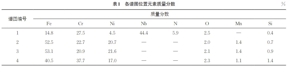 为确定HR3C钢在高温服役过程中析出第二相的种类,对6号试样进行能谱分析,结果如图6和表1所示。Nb(C,N) 相主要是供货态钢管中原有的富Nb相,尺寸较大、形状不规则、塑性较差,且与基体结合力较弱,但该相在服役过程中不会发生明显变化。由图6可知:谱图1位置为晶内大尺寸第二相,富含Nb、N元素,结合其形貌可知,该相应为富Nb相;谱图2位置为宽度明显增大的晶界;谱图3位置为晶内小尺寸单颗粒第二相,谱图2,3位置的第二相化学成分相同,主要成分为Fe、Cr、Ni元素,且含量相近,为同种第二相,结合其所处位置及形貌,可知该相为M23C6相;谱图4位置即为σ 相,该相位于三晶交界处,主要化学成分为Fe、Cr、Ni元素。表1已排除C元素后重新进行归一化处理。