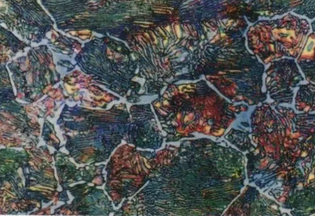 铁素体魏氏组织:在亚共析钢中,当奥氏体以快冷速度通过Ar3~Ar1温度区时,铁素体片插向奥氏体晶粒内部,这些分布在原奥氏体晶粒内部呈片状先共析铁素体被称为铁素体魏氏组织;