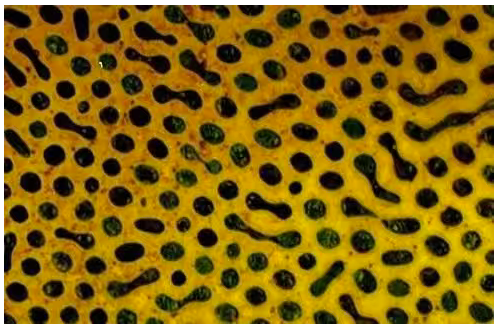 回火屈氏体:淬火马氏体经中温回火的产物,其特征是:马氏体针状形态将逐步消失,但仍隐约可见(含铬合金钢,其合金铁素体的再结晶温度较高,故仍保持着针状形态),析出的碳化物细小,在光镜下难以分辨清楚,只有电镜下才可见到碳化物颗粒,极易受侵蚀而使组织变黑。如果回火温度偏上限或保留时间稍长,则使针叶呈白色;此时碳化物偏聚于针叶边缘,这时钢的硬度稍低,且强度下降。
