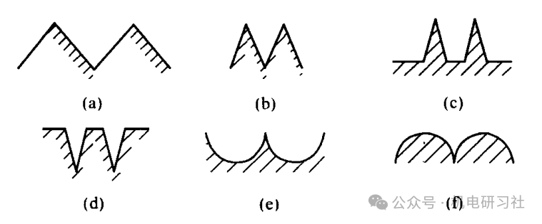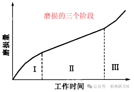 磨损的过程 机械零件的使用寿命在很大程度上取决于零件的耐磨性。在摩擦副的材料、热处理情况和润滑条件条件确定的情况下,零件的表面质量就起着决定性的作用。 零件的磨损过程通常分为三个阶段。 I :初期磨损阶段,也称为磨合阶段。当两个零件表面刚开始接触时,只是表面粗糙的凸峰相互接触,实际接触面积很小,单位面积压力很大,不能形成润滑油膜,接触处形成局部干摩擦,其应力可能超过金属的屈服极限和强度极限。随着摩擦副的相对运动,接触部分金属被撕裂、破碎或切断,凸峰很快被碾平,磨损速度较快。 II :正常磨损阶段。随着磨合过程的进行,表面粗糙度值逐渐减小,实际接触面积增大,单位面积压力减小,摩擦表面之间具有良好的润滑条件,磨损将以缓慢速度进行。 III :急剧磨损阶段。经过相当长一段时间后,随着磨损的进行,表面粗糙度值继续减小,润滑油被挤出接触面,致使接触面间形成了半干摩擦,甚至干摩擦,摩擦阻力增大,加剧了表面磨损。同时,由于实际接触面积进一步增大,促使接触表面间分子吸附力增大,从而容易出现表面分子粘合的表面咬焊现象,随着运动的进行,局部咬焊的表面将被撕裂。有时还会由于摩擦产生的大量热量,使接触表面出现高温,改变金属组织,降低表面硬度,甚至还能使局部接触表面熔焊在一起,导致磨损剧烈增加。 表面粗糙度对耐磨性的影响 零件初期磨损量与表面粗糙度值有着密切的关系。在一定工作条件下,都存在一个初期磨损量最小的最佳表面粗糙度值。一般工作情况,表面粗糙度Ra值为0.4μm~0.8μm时,初期磨损量最小。 表面轮廓对耐磨性的影响 表面轮廓形状对零件的耐磨性也有显著的影响。在相同粗糙度下,以下6种由于表面轮廓形状的差异,使零件间的实际接触面积和润滑油的存留情况变化很大,零件的耐磨性相差甚远。 (b)、(d)、(f)轮廓形状表面将比同组的(a)、(c)、(e)轮廓形状表面耐磨。 表面纹理方向对耐磨性的影响