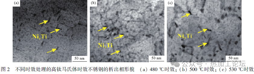 1 试验材料及方法 选择高钛马氏体时效不锈钢为研究对象,其化学成分如表1所示。首先利用电火花线切割技术从大圆棒上切取小块,然后对小块进行固溶处理,处理温度为1050℃,时间为1h,冷却方法为空冷。在固溶处理之后,对小块进行时效处理,时效温度分别为480、500和530℃,相应的时效时间分别为60、8和4h,冷却方式为空冷。根据时效温度的不同,将经上述制度热处理后的样品分别命名为480℃ 时效、500℃时效和530℃时效。上述不同热处理状态高钛马氏体时效不锈钢的拉伸性能如表2所示。对不同时效处理试样进行研磨,然后进行凹坑及离子减薄以制备透射电镜样品,最后利用Talos F200X场发射透射电镜(TEM)对微观组织进行表征。 裂纹扩展实验在Instron 8801型液压试验机上进行,试样为单边缺口三点弯曲试样,尺寸如图1所示,试样的尺寸依照GB/T 6398—2017《金属材料疲劳试验疲劳裂纹扩展方法》来进行设计。采用逐级降力法来预制疲劳裂纹,初始实验力选取6~7kN,正弦波加载,实验频率为10Hz,应力比为0.1,相邻级别载荷下降率不高于20%。在预制完疲劳裂纹之后,选择最后一级预制裂纹的载荷进行疲劳裂纹扩展实验,到试样断裂。在完成疲劳裂纹扩展速率测试后,采用电火花线切割技术切取断口表征试样,然后对试样进行超声清洗,最后在JSM-6510或Sigma 500场发射扫描电镜(SEM)下对疲劳裂纹扩展形貌进行观察。 2 试验结果与讨论 2.1 微观组织 图2给出了不同时效处理样品的显微组织。从图2中可以看出,480℃时效样品的基体中存在密集分布的颗粒状析出相和棒状析出相(图2a),而根据前人的研究可以判定析出相为Ni3Ti。500℃时效样品的析出相形貌如图2(b)所示,其基体内同样存在着大量且密集分布的析出相。从图2(c)可以看出,530℃时效样品内部棒状析出相的数量开始逐渐增多,颗粒状析出相开始逐渐减少,析出相的分布也开始变得稀疏。480℃时效、500℃时效和530℃时效样品内棒状析出相的平均长度分别约为11.5、7.9和15.9nm,平均宽度分别约为2.8、2.8和4.3nm(见表3)。综上,对比不同温度时效处理样品的微观组织可以发现,随着时效温度的升高,析出相的尺寸逐渐增大,分布逐渐变得稀疏。 2.2 疲劳裂纹扩展行为 疲劳裂纹扩展速率曲线可分为3个区域:近门槛区、稳态扩展区和高速扩展区。不同时效处理高钛马氏体时效不锈钢的疲劳裂纹稳态扩展区如图3(a)所示。从图3(a)可以看出,530℃ 时效样品的裂纹扩展速率要低于500℃时效和480℃时效样品,500℃时效和480℃时效样品的疲劳裂纹扩展速率曲线相互交叉,在ΔK较大时,500℃时效样品的疲劳裂纹扩展速率要低于480℃时效样品。 1961年,Paris根据大量实验数据提出了稳态扩展区da/dN与ΔK之间的经验公式,即Paris公式: 式中:C和m均为描述疲劳裂纹扩展性能的材料常数,分别被称为Paris 系数和指数。Paris公式可以很好地描述材料疲劳裂纹稳态扩展阶段的一般规律,通过积分能够计算出疲劳裂纹扩展寿命。图3(b)和3(c)分别给出了时效温度对C和m的影响规律,从图中可以看出随时效温度升高C值逐渐增大,m值则逐渐减小。根据Paris公式,530℃时效、500℃时效和480℃时效样品的疲劳裂纹扩展速率曲线可分别表示为: 不同时效处理的高钛马氏体时效不锈钢的疲劳裂纹扩展寿命( ΔK由14MPa·m0.5增大至25MPa·m0.5)与屈服强度之间的关系如图3(d) 所示。从图3(d)可以看出,疲劳裂纹扩展寿命呈现出随屈服强度增加而降低的趋势。 图4给出了不同时效处理的高钛马氏体时效不锈钢在ΔK为15MPa·m0.5 处的断口形貌。对480℃时效样品而言,其断口表面主要包括了河流花样和解理面(图4a);以上说明,对480℃时效样品来说,其疲劳裂纹扩展主要有两种机理:钝化-复锐和微区解理。500℃时效样品在ΔK为15MPa·m0.5 处的疲劳裂纹扩展断口形貌如图4(b)所示,从图中可以看出其断口表面同样主要由河流花样和解理面组成,只是单个解理面的尺寸会相对较小。而对530℃时效样品来说,其断口表面则全部由河流花样组成,并没有发现解理面(图4c)。当材料的疲劳裂纹以微区解理的方式扩展时,其疲劳裂纹扩展速率会大幅提高。因此,具有相对较大解理面的480℃时效样品在ΔK为15MPa·m0.5时的疲劳裂纹扩展速率会相对较快。 图5给出了不同时效处理的高钛马氏体时效不锈钢在ΔK为25MPa·m0.5 处的断口形貌。从图4(a)和5(a) 可以看出,随着裂纹扩展(ΔK的增大),480℃时效样品断口表面的河流花样逐渐消失,解理面尺寸逐渐增大。而对500℃时效样品而言,其断口表面还是由河流花样和解理面组成(图5b),而解理面的尺寸同样是随ΔK的增大而增大(图4b和5b)。530℃时效样品的疲劳裂纹扩展形貌如图5(c)所示,可以看出,ΔK从15MPa·m0.5增大到25 MPa·m0.5后,530℃时效样品的断口形貌并没有发生变化,还是由河流花样组成,且没有发现解理面。 2.3 疲劳裂纹扩展机制 疲劳裂纹在扩展时,裂纹尖端存在着一个塑性区,在外加应力强度因子范围为ΔK时,裂纹尖端的循环加载塑性区尺寸rc可以用式(5)进行计算: 式中:σy为屈服强度。从式(5)可以看出,材料屈服强度相对较低时,其裂纹尖端的循环加载塑性区尺寸会相对较大。塑性区尺寸越大越容易缓解裂纹尖端的应力集中,进而在一定程度上延缓裂纹扩展;此外,塑性区尺寸越大也越容易发生塑性诱发裂纹闭合效应,进而也能在一定程度上抑制疲劳裂纹扩展。 由此可以判断,较高温度时效处理高钛马氏