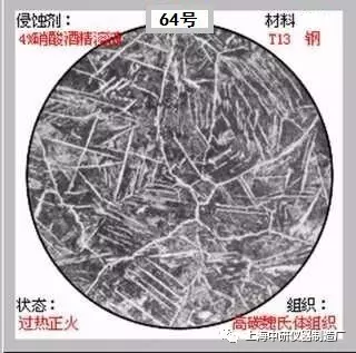 64、T13-高碳魏氏体。黑色块状为P,白色网络为Fe3C,Fe3C呈针状插入、甚至穿透P晶粒。