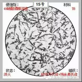 15、T8钢-淬火-针状M+Ar。高碳M呈针状,互成一定的角度。