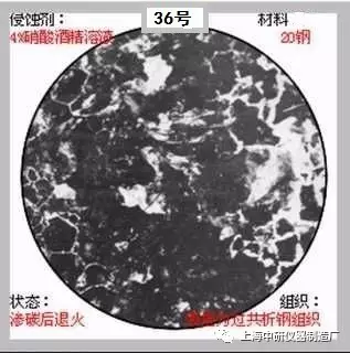 36、20钢 渗碳的平衡组织。最表层为过共析层,黑色基体为P,白色网络为Fe3Cll。