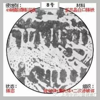8、亚共晶生铁-铸态-P+Ld+Fe3Cll,斑点装基体为共晶Ld,黑色枝晶为P。