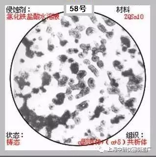 58、QSn10-亮白色树枝状为锡溶于铜钟的∝固溶体。∝树干富铜,外围较黑处富锡;树枝间隙处白色中分布很细小的点为(∝+δ)共析体。δ是以电子化合物Cu31Sn8为基的固溶体。