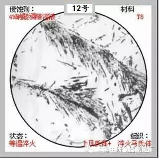 13、T8钢-等温淬火-B下+M+A残。B下是呈扁片状的过饱和F与分布在F内的短针状Fe3C的两相混合物。