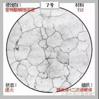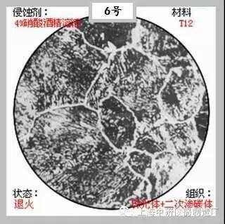 6、T12钢-退火-黑白相间的层片状基体为P,晶界上的白色网络为Fe3Cll。