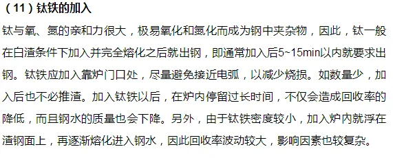 3)加入方法的影响。推渣操作以后加钛铁,即使用铁耙子粘渣以后,推开炉门区的还原渣到能看见裸露的钢水时,立即加入钛铁。回收率(如不锈钢)可稳定在60%-65%(炉渣情况和温度高低影响不太大)。一般含硅钒的结构钢由于与不锈钢相比脱氧程度高,故回收率可高到70%左右。
