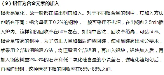 铁合金的加入顺序是首先加入脱氧能力弱的,然后加入脱氧能力较强的。合金一般在扒渣结束以后,增碳操作完成,加入部分渣料造还原渣以后开始加入。不同合金的加入要求分别如下: