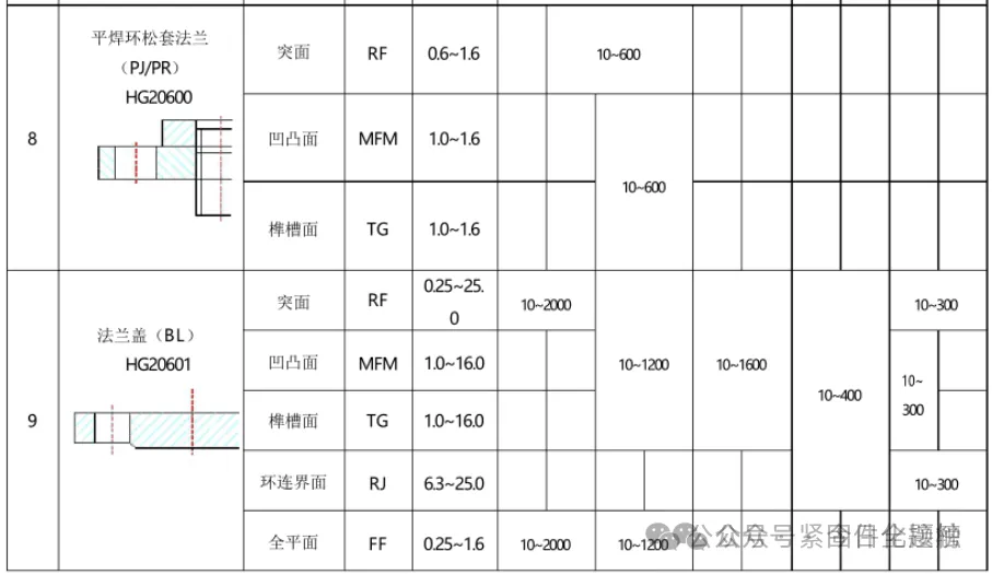 欧洲体系欧洲体系钢制法兰类型、密封面型式与公称压力PNg及工称通颈DN间的具体适配关系