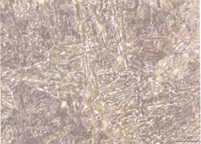 技术背景:试样取自X80钢卷中部,经磨制抛光后,用Lepera试剂(即1%偏重亚硫酸钠(Na2S2O5)蒸馏水溶液+4%苦味酸酒精溶液),以1:1体积比均匀搅拌混合作浸蚀剂。将试样浸入腐蚀液中侵蚀试样。在光学显微镜(LeicaDM6000M)下观察试样中的组织,蓝色为针状铁素体、白色为马氏体-奥氏体岛(M-A岛)、棕色为贝氏体