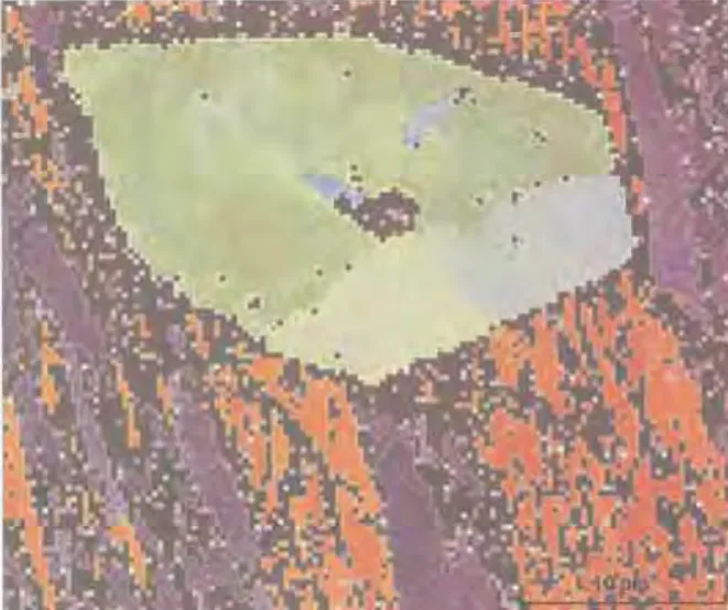 技术背景:在研究钢中铁素体转变以细小夹杂物形核机制过程中,将普通C-M钢小块试样在精密盐浴炉中加热到1250℃奥氏体化10s,随炉冷至690℃保温40s,随后水淬至室温。在试样的金相磨面上,可观察到一些在690℃刚刚转变成的小块状铁素体,其周围是未转变的奥氏体水淬后形成的板条马氏体,而铁素体中心均有细颗粒状夹杂物。能谱分析表明,其大多为MnS、Al2O3、VN或其复合夹杂。本图片是用EBSD对其中典型区域做的铁素体品粒取向分布图,绿、蓝、红三色分别代表体心立方铁素体的(101)、(111)、(100)方向,黑色像素点是未能解析的点(非铁素体点)。由图可见:初生铁素体主要呈(101)取向,其中有一些放射状的亚晶界或小角度品界(颜色差别甚微)。其周围因马氏体品格畸变较大,所以未能解析的自点较多。能谱分析表明。铁素体中心为MS夹杂颗粒,MnS夹杂附近贫锰,成分起伏差别较大,有利于形核。这是铁素体以颗粒状 MnS夹杂形核的典型证明。