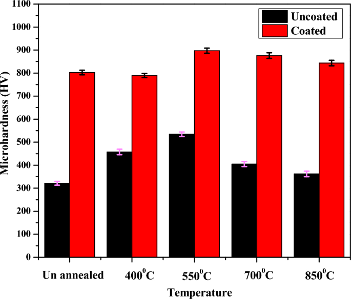 未涂层样品和经APS涂层样品的维式显微硬度如图8所示。涂层样品的平均显微硬度为794 HV。在较低温度(400℃、550℃)下退火的样品的硬度会有所提升,而在较高温度(700℃、850℃)下退火,材料的硬度却有所降低。这表明在低温退火下APS涂层样品具有出色的软化抗性。在550℃条件下退火有涂层的样品比未涂层的样品显微硬度提高了46%。而在高温条件下退火样品显微硬度出现降低是由于钢基底上存在的σ相会引起材料软化。 通常认为样品及涂层中的BCC相有助于阻碍位错的发生,从而会提高硬度。然而在高温退火下,在涂层中本身处于次要的FCC相出现扩张,从而导致显微硬度的降低34,35。通过XRD分析经550℃退火的样品BCC相的占比来证明这一点36。且在高温下的显微硬度降低还要归因于晶粒的生长和晶粒的粗化。这会导致晶粒的生长和相移,从而使材料的显微硬度降低37,38。因此,下面的测试会使用显微硬度最高的在550℃下退火的材料进行。