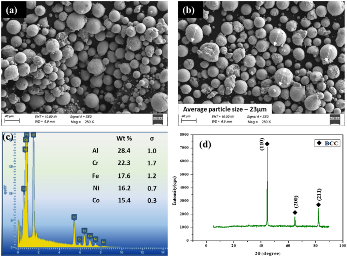 对气雾化制备的AlCoCrFeNi HEA粉末进行了微观结构分析。其SEM形态如图2a和2b所示。粉末形态为紧密堆积的球形颗粒,均匀且均质。同时,观察到较大球形颗粒上的微小准球形形成,但这些均没有偏离预期的结果,进一步验证了先前的发现28。通过HEA粉末的SEM图像可以得出形成球形颗粒是气雾化制备HEA粉末的基本原理29,30。HEA粉末颗粒的平均粒径在20–25微米之间。 通过图2c所示的EDS映射确认了形成HEA的各个元素及其比例关系,且证明了制备的HEA粉末中的杂质含量明显降低,这也可能是其具有更优秀性能的原因之一。通过对包括密勒指数在内的测试,证明了HEA粉末的相结构转变为为BCC相。并XRD验证了单相固溶体的形成(图2d)。 图二:(a) 扫描电镜图像 (b) 粒度标记 (c) 能谱元素像分析 (d) AlCoCrFeNi 高熵金属的X射线衍射谱图