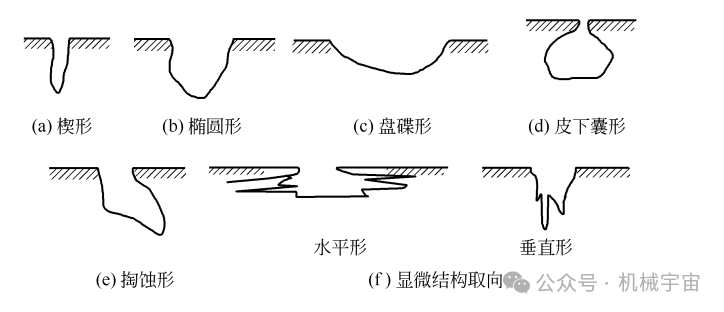 ① 集中在全局表面个别小点上的深度较大的腐蚀称为点蚀,也称孔蚀。蚀孔直径等于或小于深度。(点蚀孔的各种剖面形状,见下图)