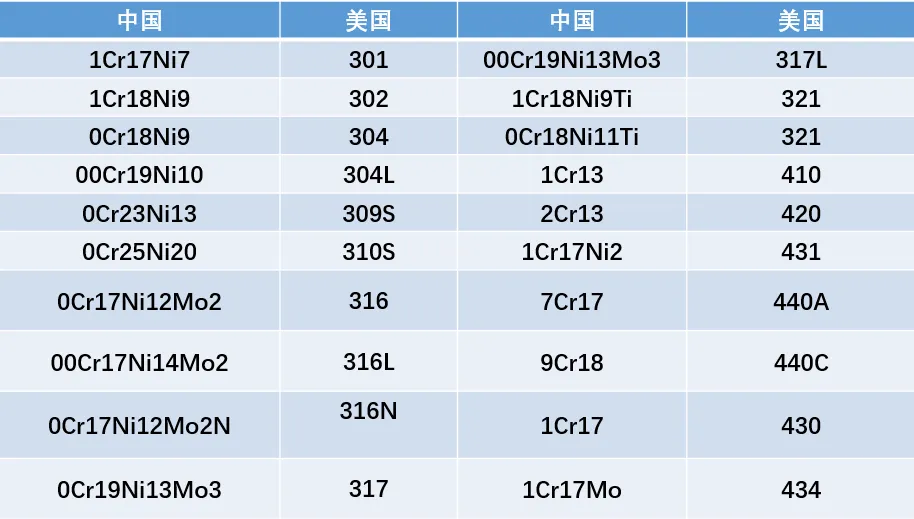 名称:合金渗碳钢。 成分:20Cr:Wc=0.2%,WCr<1.5%; 20CrMnTi:Wc=0.2%,WCr<1.5%,WMn≤1.5%,WTi≤1.5%。 性能:外硬内韧,良好的淬透性。 热处理:渗碳+淬火+低温回火。 用途:主要用来制造有优良的耐磨性耐疲劳性,又能承受冲击载荷有作用的零件。 名称:合金调质钢。 成分:40Cr:Wc=0.4%,WCr<1.5% ; 38CrMoAl:Wc=0.4%,WCr<1.5%,WAl≤1.5%,WMo≤1.5% 性能:具有高的强度和良好的塑性、韧性,有很好的淬透性。 热处理:40Cr 淬火+高温回火。 38CrMoAl钢:调质后氮化。 用途:主要用来制造受力复杂的重要零件,如齿轮、连杆等。 名称:合金弹簧钢。 成分:Wc ≈ 0.60%,WSi ≈ 2%,WMn ≤ 1.5%. 性能:高的屈服点、弹性极限、疲劳强度,一定的塑性、韧性和淬透性。 热处理:淬火+中温回火。 用途:主要用于制造各种弹簧和弹性元件,如汽车、拖拉机上的减震板簧和螺旋弹簧。 GCr15 名称:滚动轴承钢。 成分:Wc=0.95~1.1%,WCr=1.5% 性能:高的接触疲劳强度、高的硬度和耐磨性、足够的韧性和淬透性。 热处理:球化退火+淬火+低温回火。 用途:主要用来制造滚动轴承的滚动体(滚珠、滚柱、滚针)、内外套圈等。 9SiCr 名称:合金刃具钢。 成分:Wc=0.9%,WCr<1.5%. WSi<1.5% 性能:高的硬度和耐磨性、足够的强度和一定的韧性。 热处理:淬火+低温回火。 用途:主要用来制造刀刃细薄的低速切削刀具。 W18Cr4V 名称:高速工具钢。 成分:Wc =0.7~0.8%,WW≈18%,WCr≈4%,WV≤1.5%。 性能:高的硬度和耐磨性、足够的强度和一定的韧性,很高的热硬性(600℃)。 热处理:高温淬火+多次高温回火。 用途:主要用于制造切削速度较高的刀具和形状复杂载荷较大的成型刀具。 3Cr13 名称:马氏体不锈钢。 成分:Wc=0.3%, WCr=13%。 性能:具有较高的强度和硬度,有抗大气、蒸气等介质腐蚀的能力 。 热处理:淬火+低温回火。 用途:主要用于制造力学性能要求较高而在弱腐蚀介质中工作、耐蚀性要求较低的机械零件和工具。 0Cr18Ni9(304) 、1Cr18Ni9Ti(321) 名称:奥氏体不锈钢。 成分:0Cr18Ni9(304):Wc<0.08%,WCr≈18%,WNi≈9%; 1Cr18Ni9Ti(321):Wc≈0.1%,WCr≈18%,WNi≈9%,WTi≤1.5%。 性能:具有较高的耐蚀性,塑性和低温韧性,以及高的加工硬化能力,无磁性,而且具有良好的焊接性能,是工业上应用最广泛的不锈钢。 热处理:固溶处理。 用途:主要用于制造强腐蚀介质中工作的设备及冷变形的低负荷零件,如吸收塔、酸槽、管道等。 中美不锈钢牌号对照表