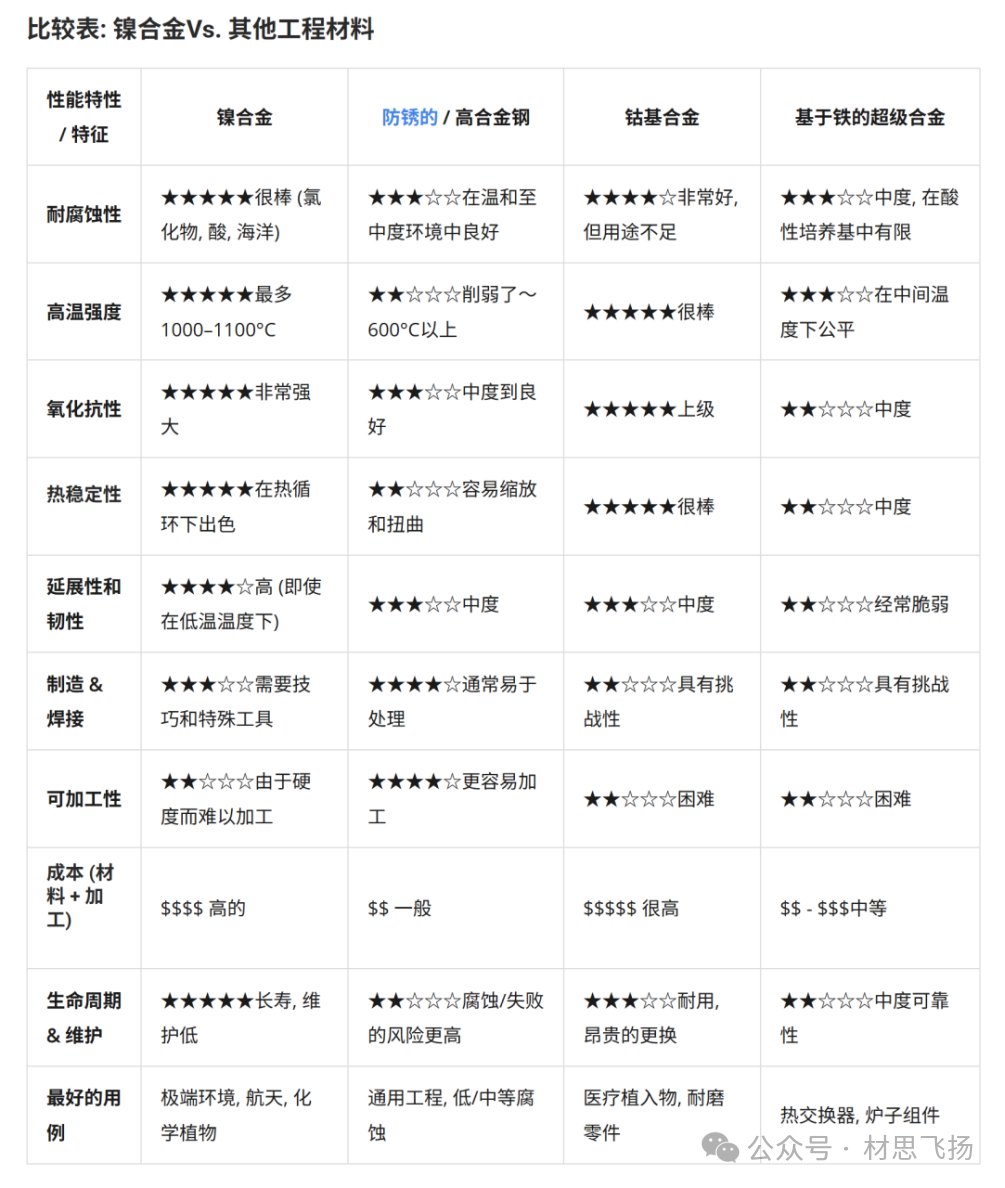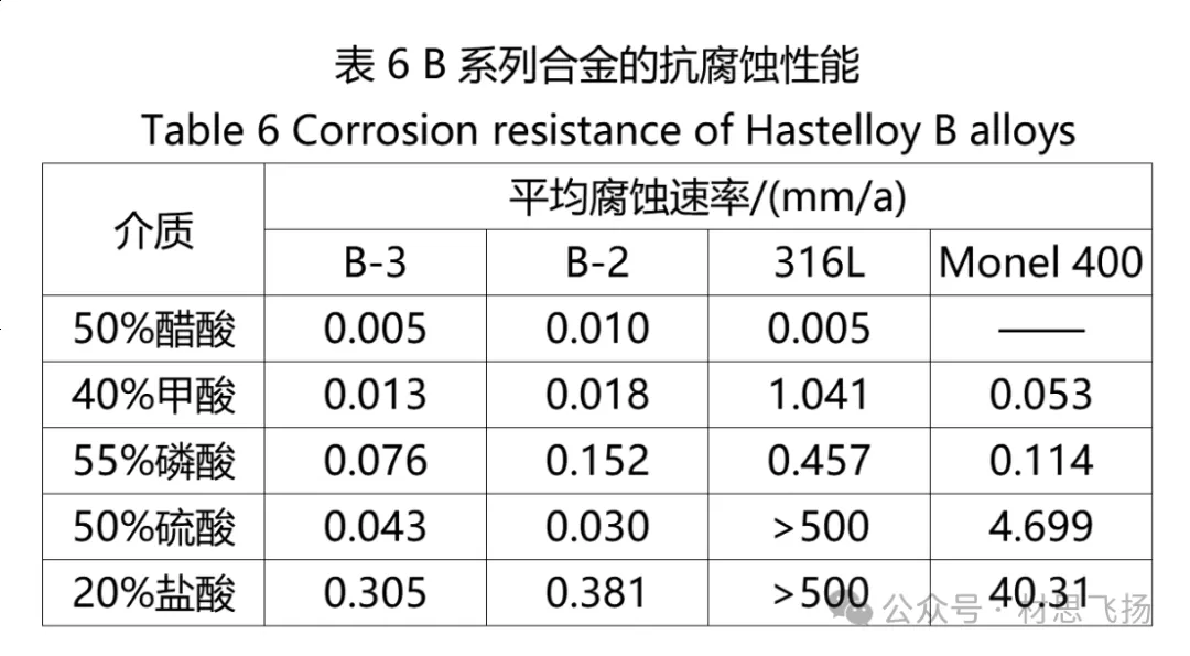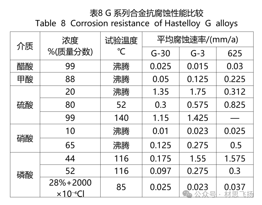 以铬(Cr)、钼(Mo)为主要合金元素的超低碳型镍 - 铬 - 钼(Ni - Cr - Mo)系合金,亦被称作哈氏(Hastelloy)合金。Hastelloy 为美国 Haynes International 公司之商标,其由 HAYNES 中的“HA”、STEI.LITE 中的“STELL”以及 ALLOYS 中的“OY”组合而成。哈氏合金作为一种高级镍基合金,针对多种恶劣腐蚀环境,诸如湿氧、亚硫酸、强氧化盐介质等,均展现出卓越的抗腐蚀性能。如表5 所示,哈氏合金主要涵盖 A、B、C、D、F、G、N、W、X 等系列。在国际上,生产哈氏合金系列产品的企业主要包括美国 Haynes International Inc(国际汉斯公司,为哈氏合金系列的研发企业)、Special Metal(超合金集团)以及德国蒂森克虏伯公司。B系列包括B、132及B3等型号,其在典型环境中的耐腐蚀性能列于表6。Hastelloy B合金在耐盐酸腐蚀方面表现最佳。通过将Hastelloy B合金的碳含量降至0.02%、硅含量降至0.1%,便制成了Hastelloy B-2合金。该合金可在沸腾温度下适用于各种浓度的盐酸环境,并提升了在敏化状态和焊接后的抗晶间腐蚀能力。20世纪90年代,Hastelloy B-3的开发解决了B-2在中间温度时易析出Ni-Mo沉淀相的问题,优化了加工特性。然而,Hastelloy B与Hastelloy B-2合金因铬含量极低,不适用于氧化性环境。哈氏合金C属于Ni - Cr - Mo系,是一种能够适应各类环境的通用型耐腐蚀材料。C系列合金的合金化程度相对较高,其中Cr元素和Mo元素分别在抵抗氧化性介质腐蚀和还原性介质腐蚀方面发挥作用,并且二者协同作用以抵御局部腐蚀(如点蚀和缝隙腐蚀)。C类合金在典型环境下的耐腐蚀性能如表7所示。哈氏合金G属于Ni - Cr - Cu - Mo系合金。相较于Ni - Cr - Mo合金,含铜的Ni - Cr - Mo - Cu合金在硫酸、磷酸等介质中展现出更为优异的耐腐蚀性能。含高铬量的Ni - Cr - Mo - Cu合金在硫酸、磷酸、含F⁻、Cl⁻的硫酸、磷酸以及湿法磷酸等介质中具备良好的耐蚀特性。向Ni - Cr - Mo - Cu合金中添加硅(Si)、硼(B),可使其耐受热浓硫酸腐蚀,同时具有较高的硬度与良好的耐磨性能。G系列合金包括G、G - 3、G - 30、G - 50等。G类合金在典型环境下的耐蚀性能如表8所示。哈氏合金G - 3、G - 30的研发成功,解决了合金在强氧化性或混合酸环境下的应用难题。新型哈氏合金G - 35本质上为Ni - Cr - Mo合金,其成分与C系合金相近。鉴于该合金的研发同样是针对强氧化性以及混合酸环境,故其商业牌号仍归属于G系列。