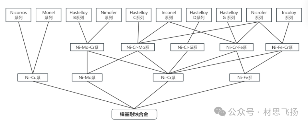 研究显示,合金元素提升合金耐腐蚀性能的效应,源于镍合金表面所形成的钝化膜的稳定性。镍基合金中的镍含量均在30%以上,其中,W(Ni + Fe)≥50%的被定义为铁镍基耐蚀合金,W(Ni)≥50%的则被定义为镍基耐蚀合金,在实际应用中,二者均可被视作镍基耐蚀合金,其分类情况如表2所示。图3所示为镍基耐蚀合金家族图谱,其中几种合金的耐蚀特性如表3所示。