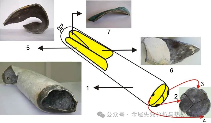 沿断口面上高度发展的人字形条纹追踪分析,确定了两处独立的裂纹起始位置:第一处位于圆柱段上部,第二处位于底盖中心。随后,明确了筒体的整体开裂形态以及所有碎片的原始位置,如图2所示。