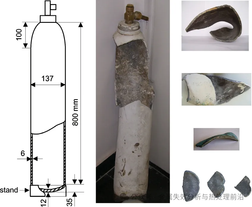 图1展示了气瓶的示意图及事故现场收集到的碎片照片。本文报告了为查明此次事故原因所开展的主要工作。