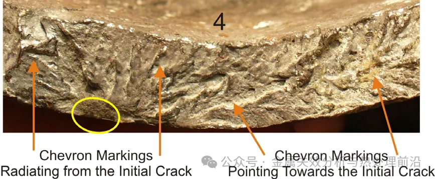 图 8:自裂纹起裂点向外辐射的人字形条纹指向初始半椭圆形裂纹(碎片编号 4)。本图色彩已作调整,以增强裂纹表面特征的对比度。