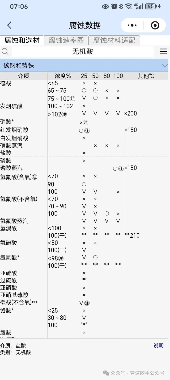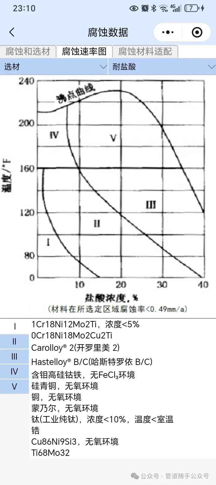 从以上可以看出,耐盐酸材料的选择是一项艰巨的任务,需要综合考虑多种因素。由于不同的材料在不同的环境介质中会表现出不同的耐腐蚀性,因此选择耐酸金属材料首先要考虑材料所处的腐蚀环境(如盐酸浓度、温度、其他杂质)。席勒对耐盐酸腐蚀材料进行了系统的研究,并绘制了耐盐酸腐蚀材料的选择图。图1显示了在不同盐酸浓度和温度下腐蚀速率为0.05mm/年的等腐蚀线,这通常用作合金选择的设计上限。从图中可以看出,盐酸的浓度-温度状态图分为五个区域,每个区域适用的温度和浓度范围的材料列于表中。值得注意的是,表中所列的各种金属材料均来源于大量的腐蚀试验数据和工厂的经验,没有考虑经济因素。 图1.耐盐酸材料的选择 表中所列的材料仅适用于材料处于静态或低流速浓盐酸中的情况。如果盐酸含有其他杂质,这些杂质会显著改变材料的腐蚀特性,或者酸的高流速会使材料磨损和腐蚀,则表中列出的材料可能无法起到防止盐酸腐蚀材料的作用。而且我们在选材的时候,还要考虑材料的物理性能、力学性能、经济性、供货周期、工作条件等因素进行综合分析比较。