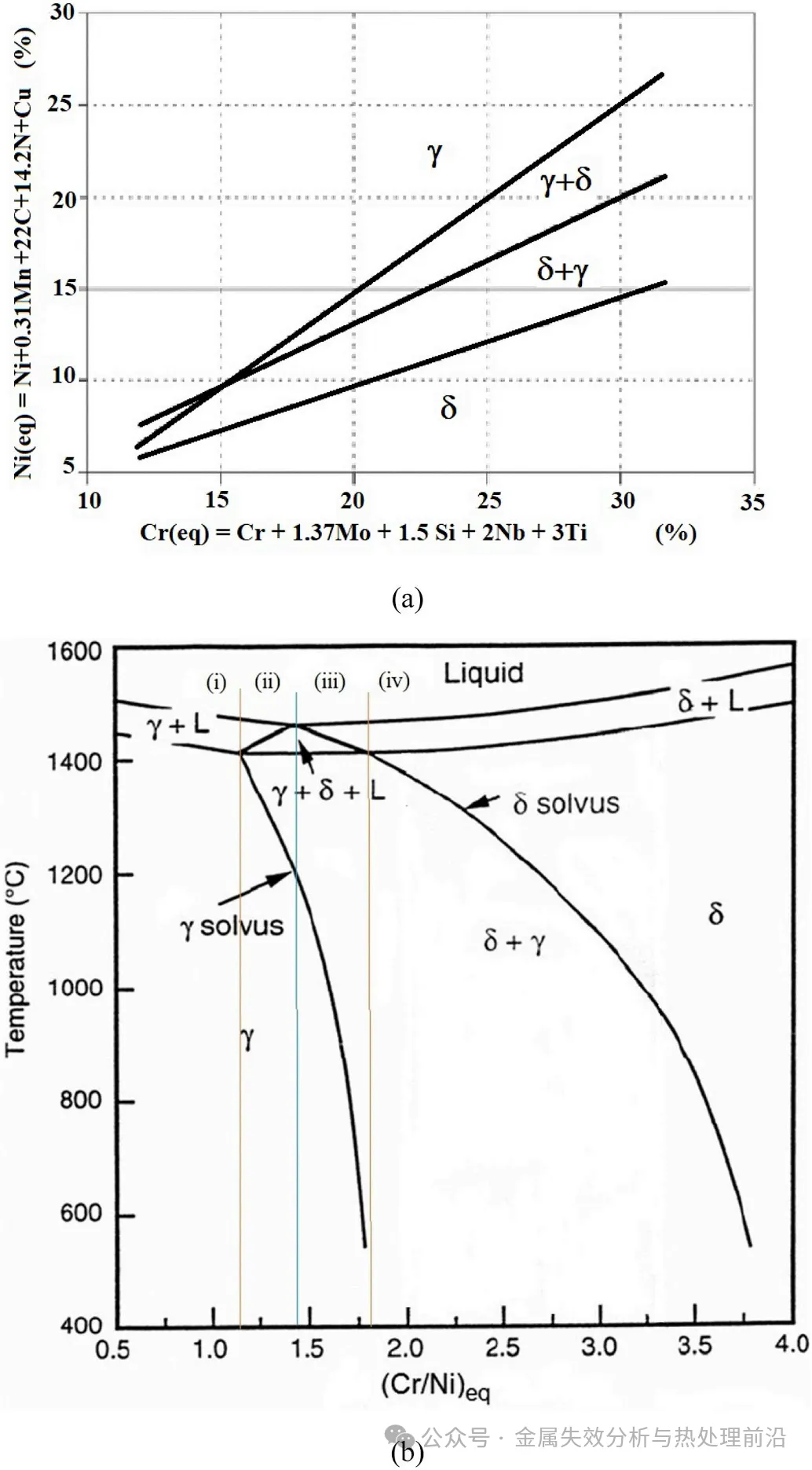 图4. 凝固模式。(a)不锈钢凝固模式随其镍当量(Nieq)与铬当量(Creq)变化的关系图;(b)Fe-Cr-Ni-X相图的截面图,依据Creq与Nieq比值标示了(i)奥氏体、(ii)奥氏体-铁素体、(iii)铁素体-奥氏体及(iv)铁素体四种凝固路径(Nieq = Ni + 35C + 20N + 0.5Mn + 0.25Cu;Creq = Cr + Mo + 1.5Si + 0.7Nb)。