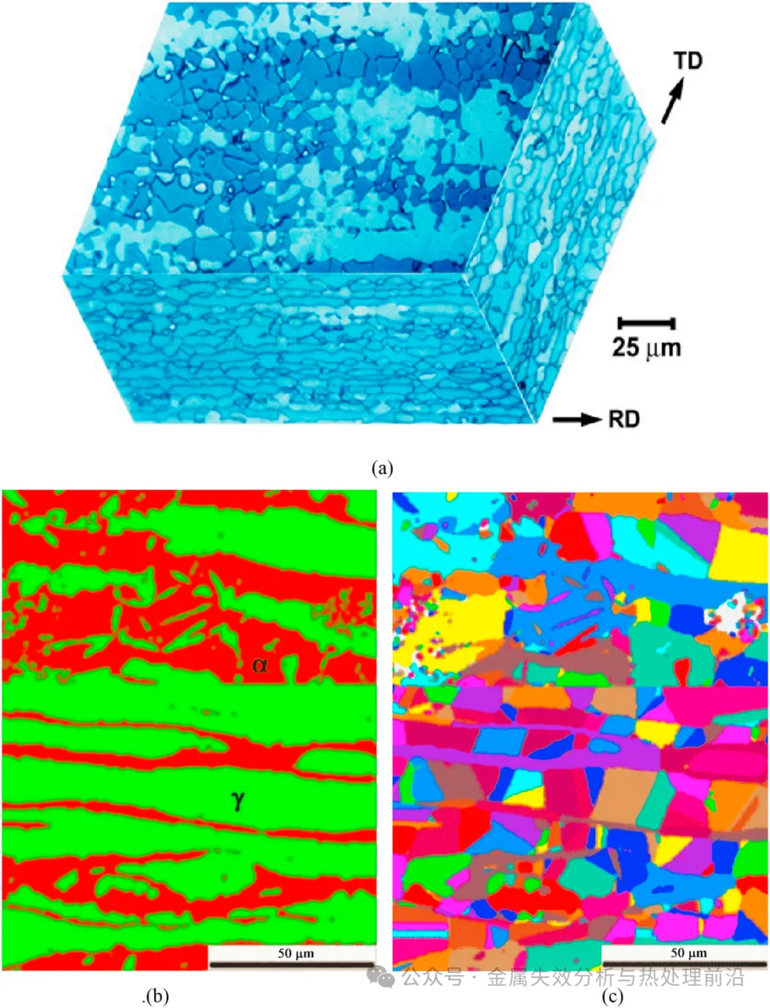 图3. 双相显微组织。(a)一种轧制双相不锈钢薄板(UNS S31803,参见表1)的三维显微组织,其中铁素体为较暗相;(b)轧制UNS S32750双相不锈钢中铁素体与奥氏体的EBSD图像;(c)取向成像图——与(b)相同视场——用于在层片状双相不锈钢中清晰显示奥氏体与铁素体相的晶界