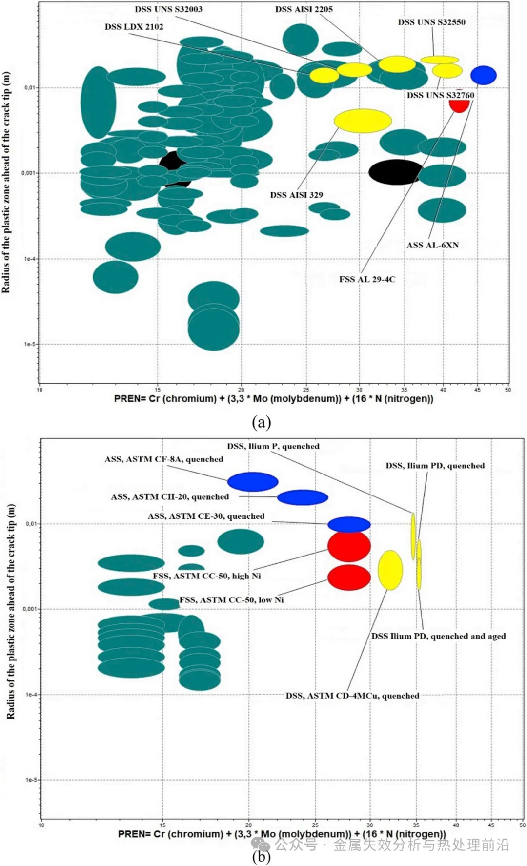 图2. 性能图谱:塑性区半径与PREN(点蚀当量数)的关系。塑性区半径取值为断裂韧性与屈服强度平方之比:(a) 加工态不锈钢;(b) 铸造态不锈钢。两图均突显了铸造态与加工态双相不锈钢优异的力学性能与耐腐蚀性能组合(见黄色区域)。为便于比较,图中亦标出了少量铁素体不锈钢(FSS,红色)与奥氏体不锈钢(ASS,蓝色)的示例