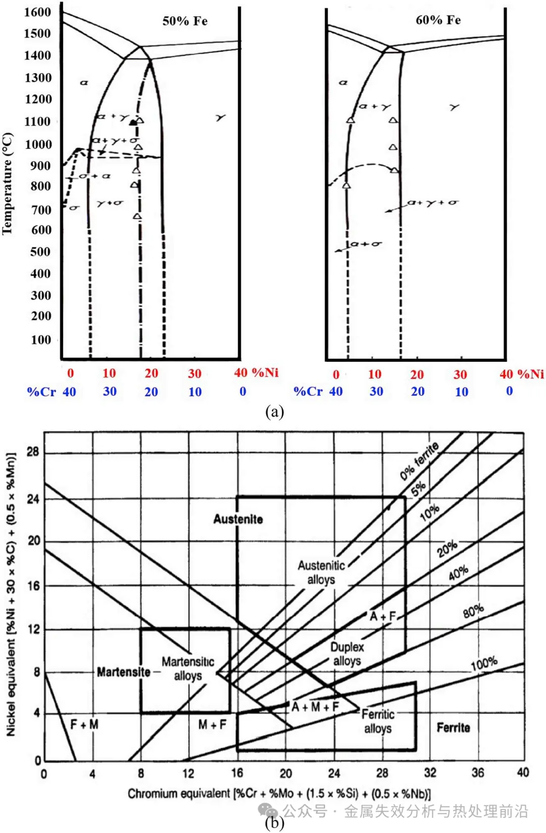 图1. 稳定相与不稳定相。(a) Fe-Cr-Ni相图的截面图,系1931至1939年间针对含铁50%与60%的体系获得,显示存在(奥氏体+铁素体)两相区,以及脆性σ相的稳定温度区间[4];(b) 施费勒组织图,依据铬当量与镍当量数值,显示不锈钢在快速冷却(如铸造与焊接)后的微观组织。图中双变量坐标图标出了铁素体不锈钢、马氏体不锈钢、奥氏体不锈钢及双相不锈钢的典型化学成分范围