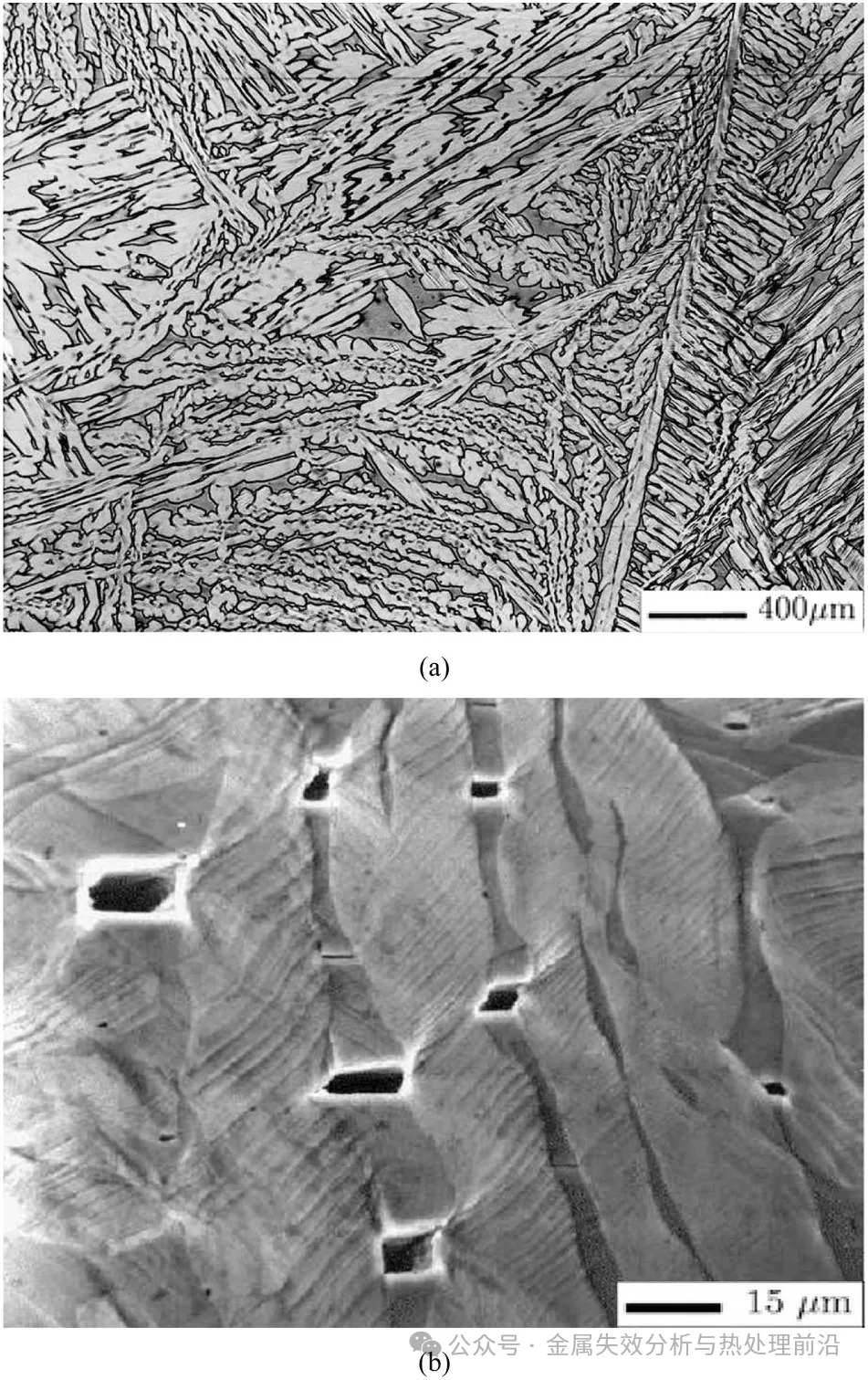 图6. 低碳Y4331双相不锈钢铸件。(a)铸态微观组织,特征为铁素体基体(约20%铁素体)中分布着奥氏体片层;(b)400 °C时效700小时后的微观组织。拉伸试验后观察到铁素体相的裂纹形核与解理断裂(475 °C脆化),奥氏体相发生塑性变形。铁素体相的解理断裂由富铬α′相的形成引起(铁素体 → 贫铬铁素体 + 富铬α′相)