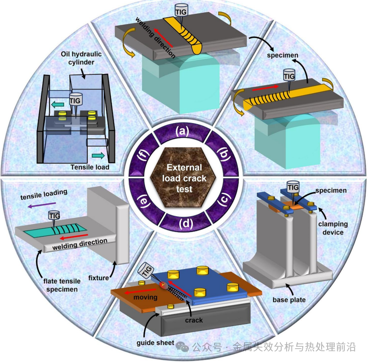 图36 外加载荷作用下裂纹试验方法:a Varestraint 试验,b 横向Varestraint 试验,c U型热裂纹试验,d 横向运动可焊性(TMW)试验,e 程序化变形速率(PVR)试验,f 横向拉伸式热裂纹试验。