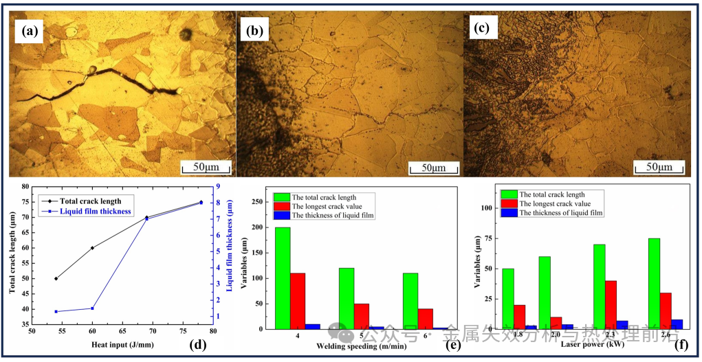 图27 不同热输入对GH909镍基高温合金激光焊接接头液化开裂敏感性的影响分析:a液化开裂形貌;不同热输入下热影响区显微组织:b 60 J/mm,c 78 J/mm,激光焊接热输入对热影响区开裂的影响;焊接参数对热影响区开裂的影响:e焊接速度,f激光功率