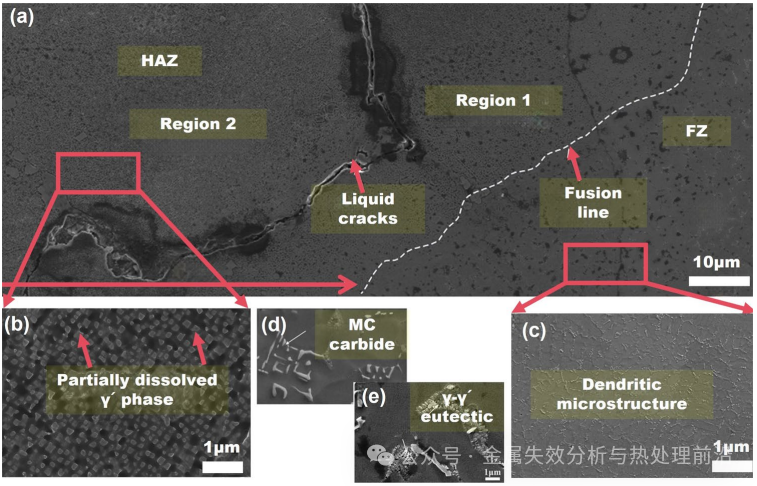 图26 不同热输入下718Plus镍基高温合金热影响区液化开裂分析:低热输入条件下718Plus高温合金激光焊缝熔合区与热影响区的光学显微照片,b高热输入焊接条件,c共晶回填,d高热输入激光焊无裂纹热影响区中的晶界液化,e热影响区晶界增厚现象。