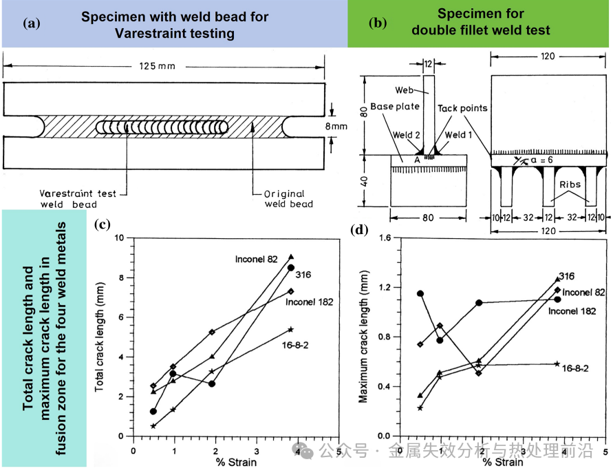 图 37 Varestraint 试验与双角焊缝试验结果: a 用于Varestraint试验的带焊道试样,b 双角焊缝试验试样,c 四种焊缝金属熔合区内的总裂纹长度焊缝金属,d 四种焊缝金属熔合区内的最大裂纹长度