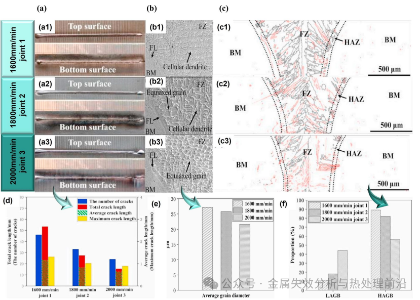 图20 不同焊接速度对IC10镍基高温合金电子束焊接凝固裂纹敏感性的影响分析:a 接焊缝宏观形貌:a1 1600 mm/min 接头 1; a2 1800 mm/min 接头 2; a3 2000 mm/min接头3;b 不同焊接速度下对接焊缝熔合区的显微组织:b1 1600 mm/min接头1;b2 1800 mm/min接头2;b3 2000 mm/min接头3;c 不同焊接速度对接焊缝的晶界形貌:c1 1600 mm/min接头1;c2 1800 mm/min接头2;c3 2000 mm/min接头3;d 不同焊接速度对接焊缝的裂纹统计;e 不同焊接速度对接焊缝的平均晶粒尺寸;f 小角度晶界与大角度晶界比例图。
