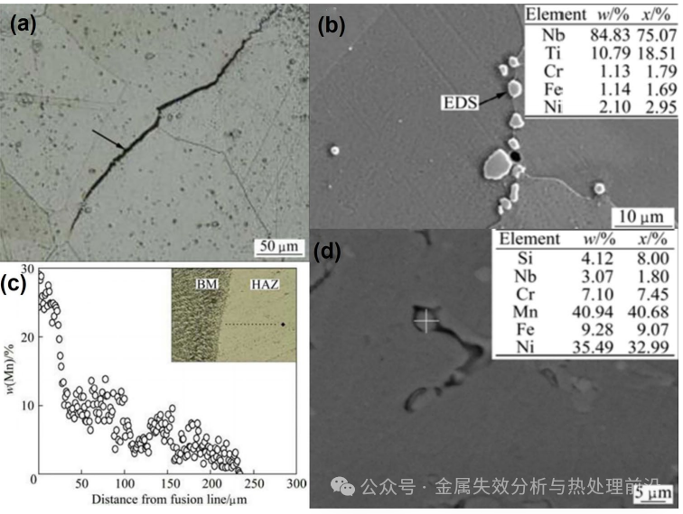 图24 Mn含量对GH4169 镍基高温合金电子束焊接液化开裂敏感性的影响:a 液化开裂形貌,b晶界处化合物的EDS分析,c热影响区内Mn分布,d能谱分析显示的焊缝断口形貌