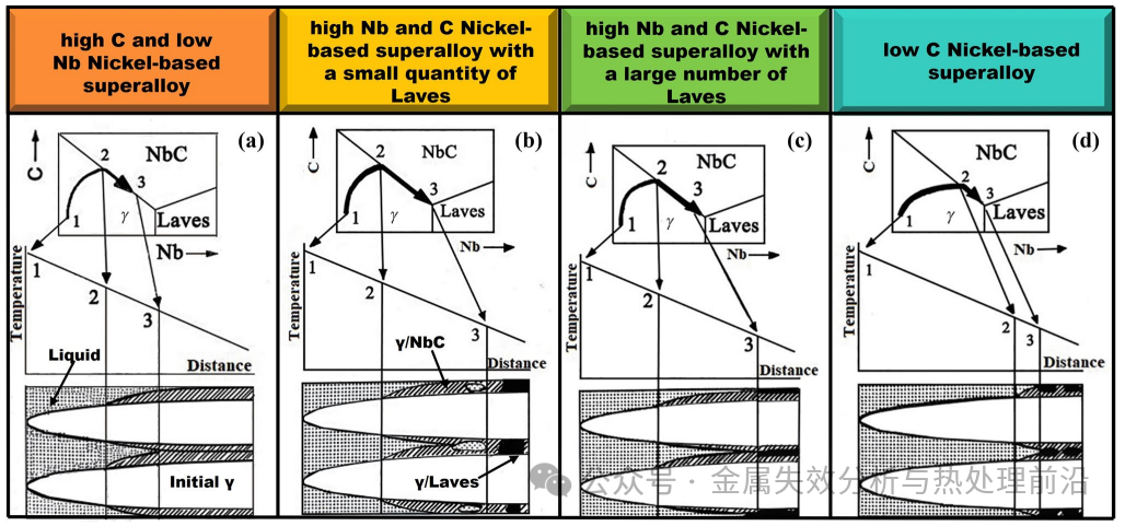 图14 四种含Nb镍基高温合金的不同显微组织示意图:a 高C低Nb镍基高温合金;b 少量Laves相的高Nb高C镍基高温合金;Laves相数量;c 高Nb高C镍基高温合金(含大量Laves相);d 低C镍基高温合金
