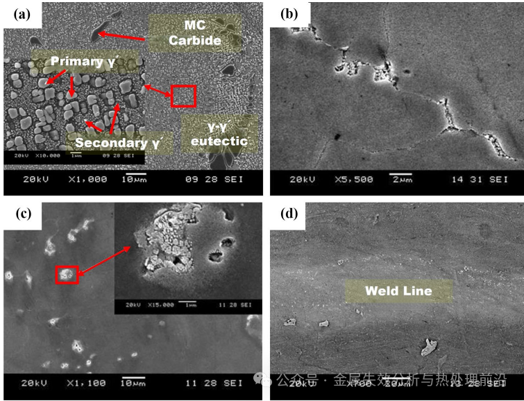 图8 焊接接头微观组织:a 经固溶热处理的IN-738显微照片,显示初生与次生γ′ 析出相、MC型碳化物及γ–γ′共晶;b 晶间熔化;c 晶内熔化;d IN-738中无裂纹线性摩擦焊连接接头的显微照片