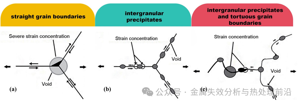 图30 晶界析出相对晶界滑移、应变集中及孔洞形成的影响:a 平直晶界,b 晶界析出相的影响,c 晶界析出相与曲折晶界共同作用的影响