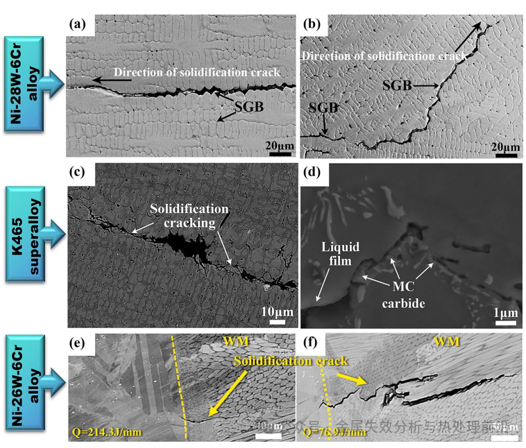 图10 镍基高温合金中凝固裂纹形貌:a、b Ni–28W–6Cr合金中凝固裂纹的显微组织,c Ni–28W–6Cr合金中凝固裂纹的显微组织,K465高温合金中的情况及d MC型碳化物与液膜,e、f Ni–26W–6Cr 合金中凝固裂纹的显微组织。
