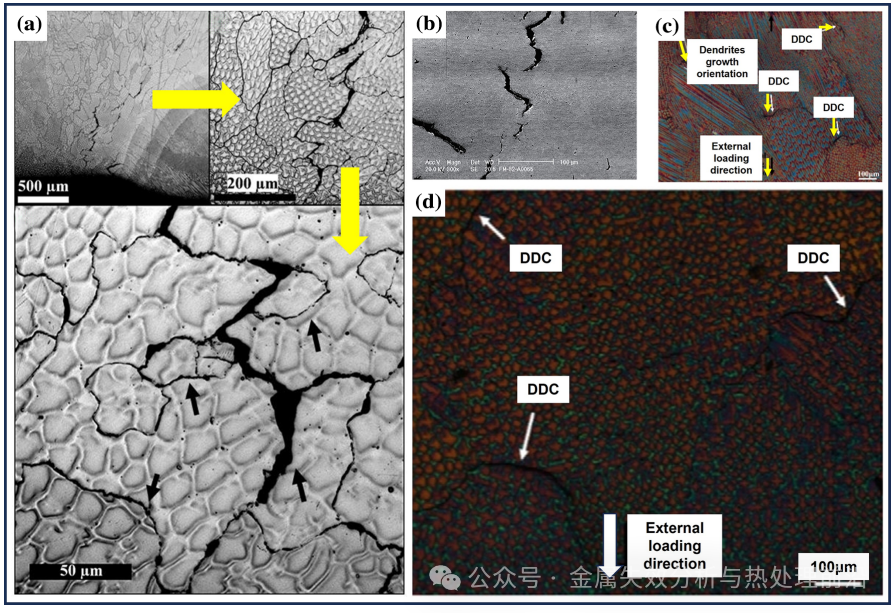 图29 DDC微观形貌:a 690镍基高温合金的DDC[179],b FM-82的塑性下降开裂[180],c、d 多道ERNiCrFe-7A堆焊层的DDC