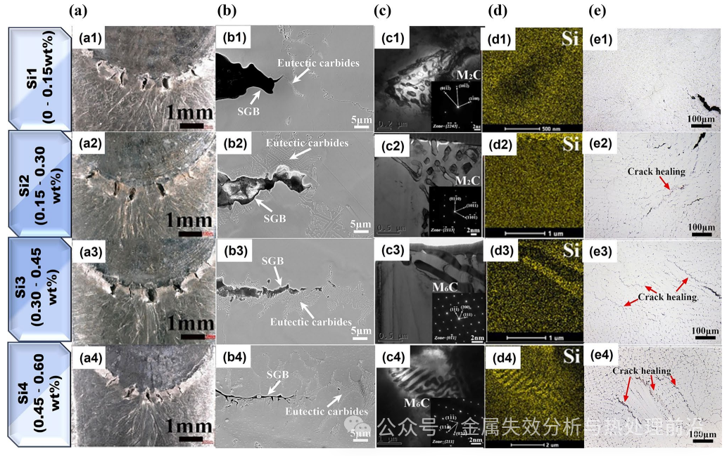 图15 不同Si含量ERNiMo-2焊丝对GH3535镍基高温合金焊接凝固裂纹敏感性的影响分析:a 6%应变下的横向可变拘束试验结果:a1 Si1、a2 Si2、a3 Si3、a4 Si4;b 裂纹表面形貌:b1 Si1、b2 Si2、b3 Si3、b4 Si4;c 透射电镜(TEM)裂纹尖端共晶碳化物的形貌图像:c1 Si1、c2 Si2、c3 Si3、c4 Si4;d 裂纹尖端共晶碳化物的EDX分析结果:d1 Si1、d2 Si2、d3 Si3、d4 Si4;e 焊缝金属中由共晶回填引发的裂纹愈合现象:e1 Si1、e2 Si2、e3 Si3、e4 Si4