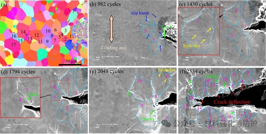 (a) Ti-2Al-2.5Zr合金在疲劳试验前含有295ppm氢的IPF,以及σmax=505MPa时的疲劳裂纹扩展行为,(b) 982次循环,(c) 1430次循环,(d) 1794次循环,(e) 2048次循环,以及(f) 2534次循环