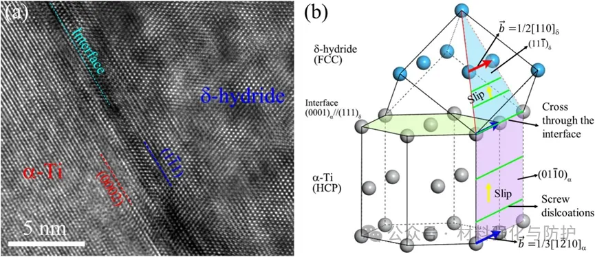 (a) B型δ-氢化物与α-Ti基体界面处的高分辨率透射电子显微镜图像,(b)棱面螺位错穿过界面的示意图